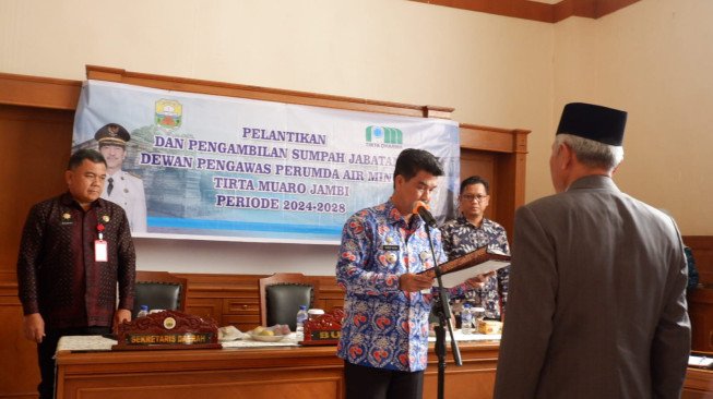 SWARAJAMBI, MUAROJAMBI – Penjabat Bupati Muarojambi Raden Najmi didampingi sekretaris Daerah Muarojambi Budhi Hartono menghadiri dan melantik dewan pengawas Perumda Air Minum Tirta Muaro Jambi di ruangan expose Setda Kabupaten Muaro Jambi, Kamis (25/7/2024).