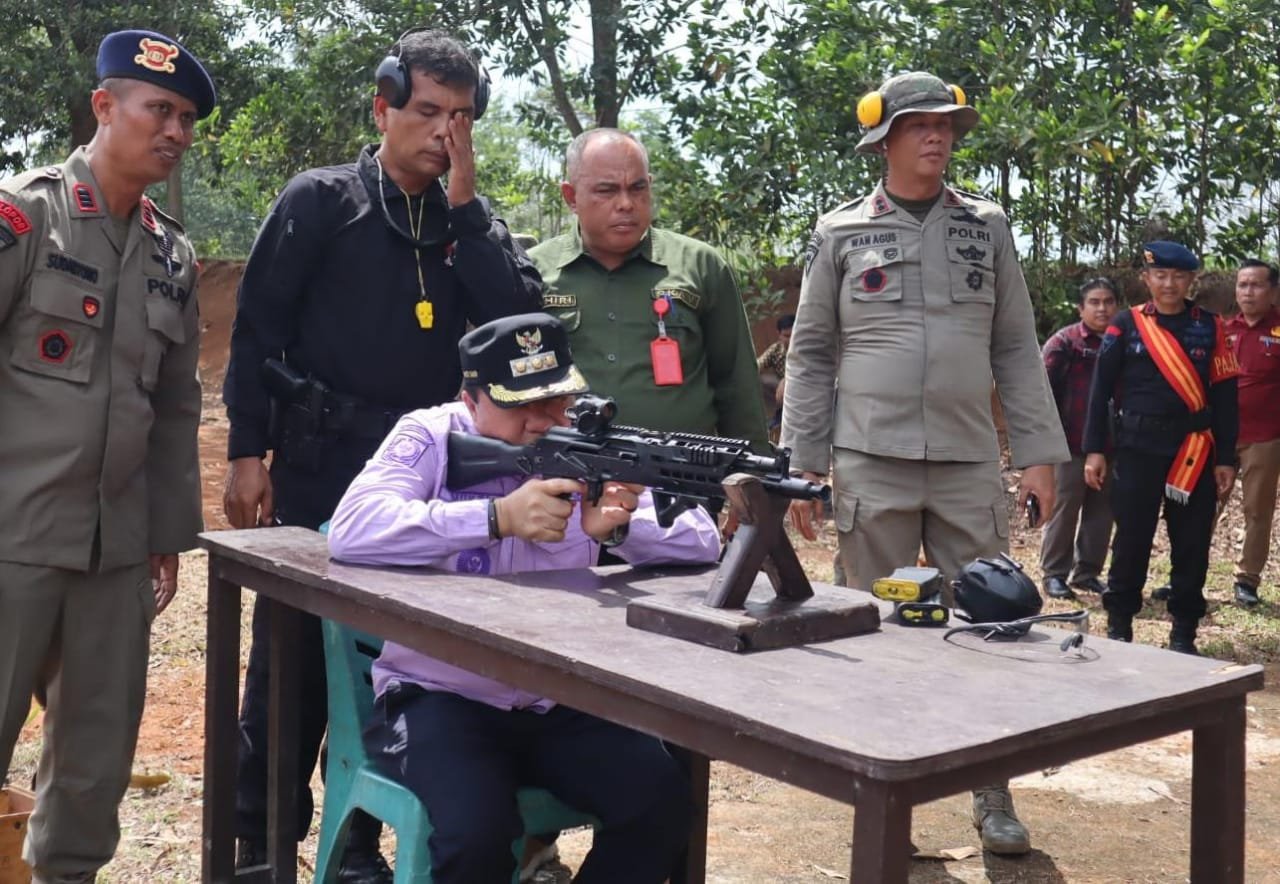Saat berlatih menembak, H Mukti didampingi Asisten II Setda Merangin Suherman, Kepala DPKAD Merangin Mashuri, Kadis Peternakan dan Perkebunan Hendri, Kalak BPBD Merangin Syahiri, Kaban Kesbangpol Merangin Mulyono dan Kabag Umum Iwan.