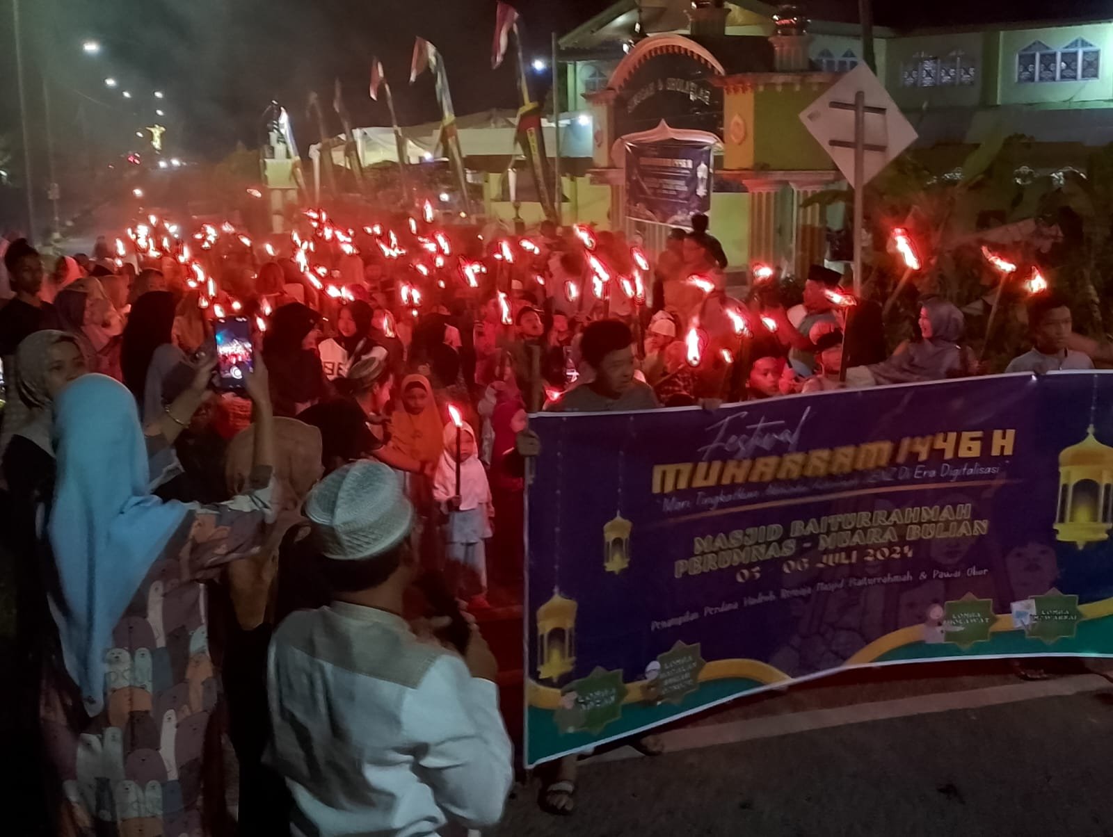 SWARAJAMBI, BATANGHARI – Warga sekitar Masjid Baiturrahma Prumnas Muarabulian, Sabtu (6/7/2024) malam, melakukan pawai obor menyambut Tahun Baru Islam 1 Muharram 1446 Hijriah.