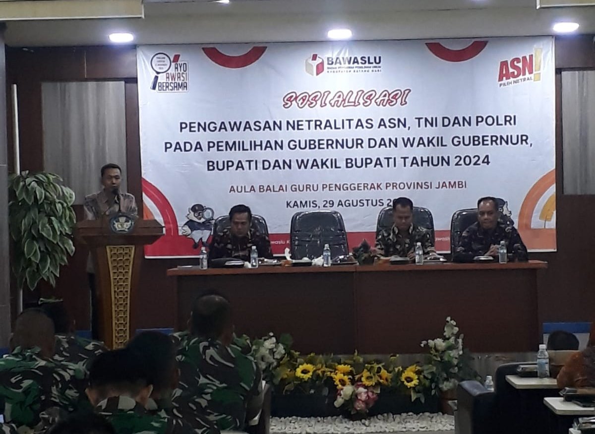 SWARAJAMBI, BATANGHARI – Badan Pengawas Pemilu (Bawaslu) Kabupaten Batanghari mengadakan sosialisasi pengawasan netralitas Aparatur Sipil Negara (ASN) dan TNI-Polri, Kamis (29/8/2024). Kegiatan yang dilaksanakan di Aula Balai Guru Penggerak Muarabulian ini untuk mewujudkan Pemilihan Kepala Daerah (Pilkada) serentak tahun 2024 yang demokratis dan berintegritas di Kabupaten Batanghari.