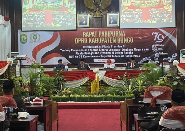 SWARAJAMBI, MUARABUNGO – Dewan Perwakilan Rakyat Daerah (DPRD) Kabupaten Bungo menggelar rapat paripurna mendengarkan pidato kenegaraan Presiden dalam rangka Hari Ulang Tahun (HUT) ke-79 Republik Indonesia tahun 2024 melalui siaran langsung di media televisi, Jumat (16/8/2024).