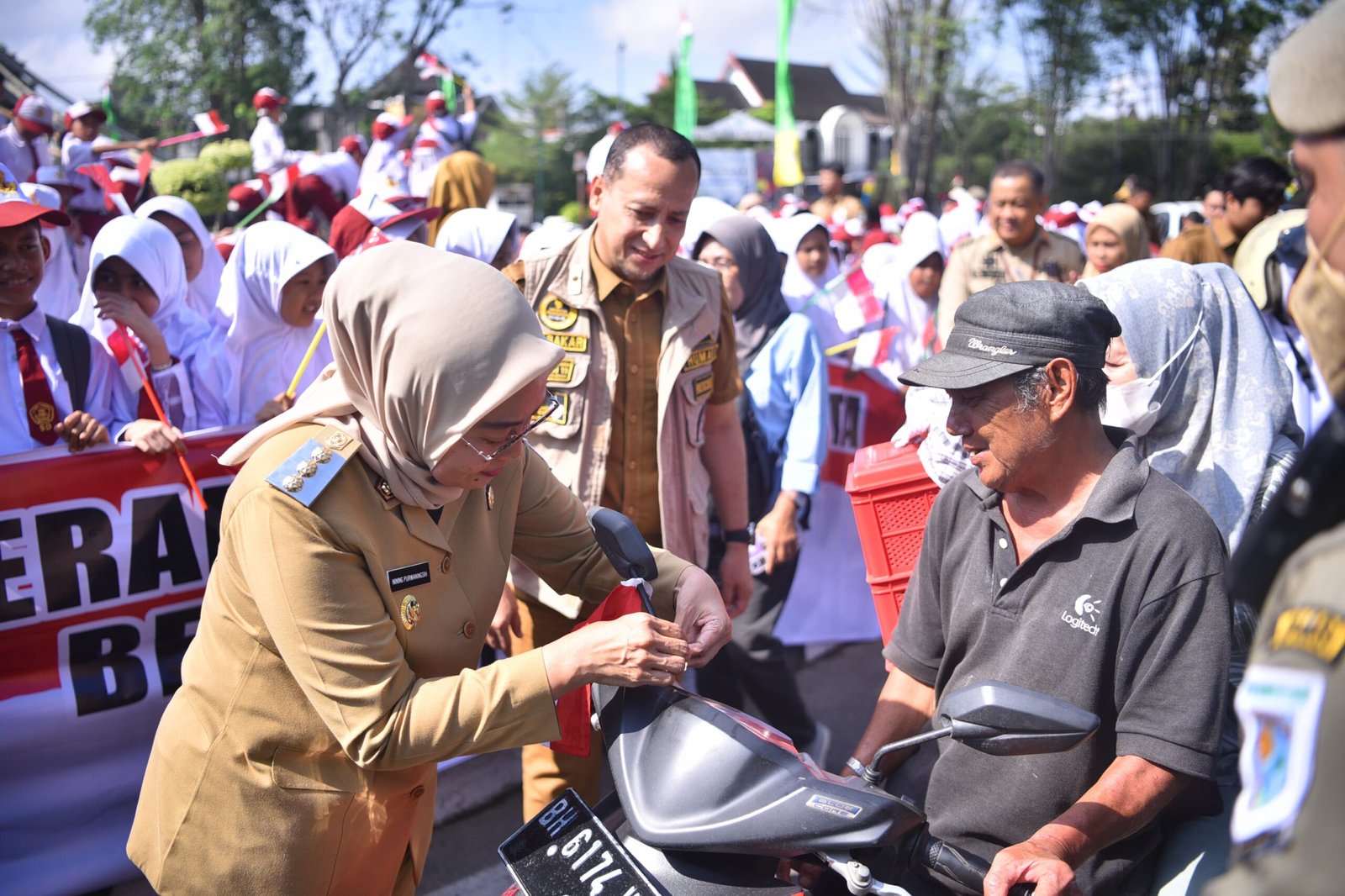 Tampak Penjabat (Pj) Wali Kota Jambi, Sri Purwaningsih memimpin pembagian bendera secara cuma-cuma tersebut. Ia membagikan bendera Merah Putih kepada ratusan siswa-siswi yang hadir dalam kegiatan tersebut serta kepada pengendara kendaraan roda dua dan empat yang melintasi kawasan itu.