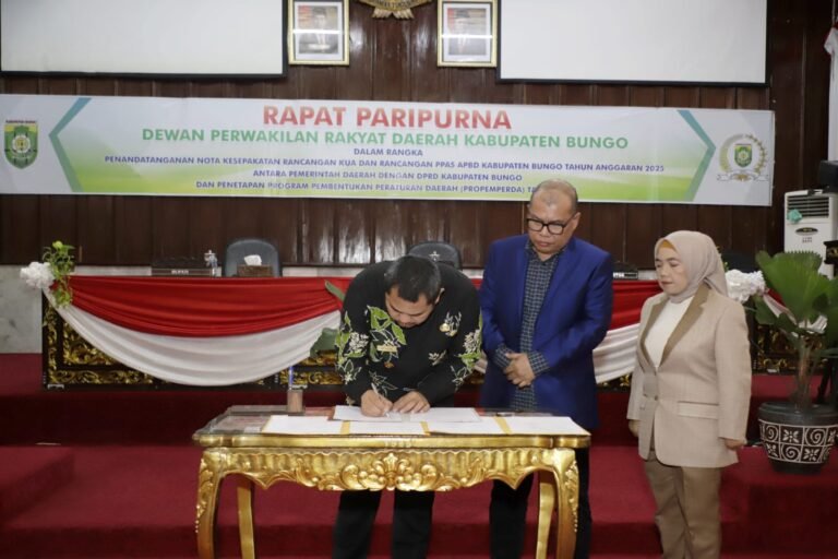 Bupati Bungo H.Mashuri menandatangani nota kesepakatan rancangan KUA dan rancangan PPAS tahun anggaran 2025. Acara penandatanganan itu berlangsung di ruang paripurna DPRD Kabupaten Bungo.