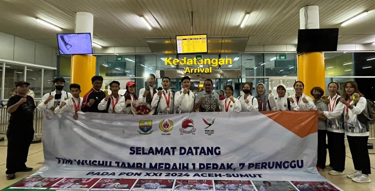 SWARAJAMBI, JAMBI – Tim Wushu Jambi tiba di Bandara Sultan Thaha usai berlaga di PON Aceh-Sumut 2024, Selasa (17/9/2024) malam.