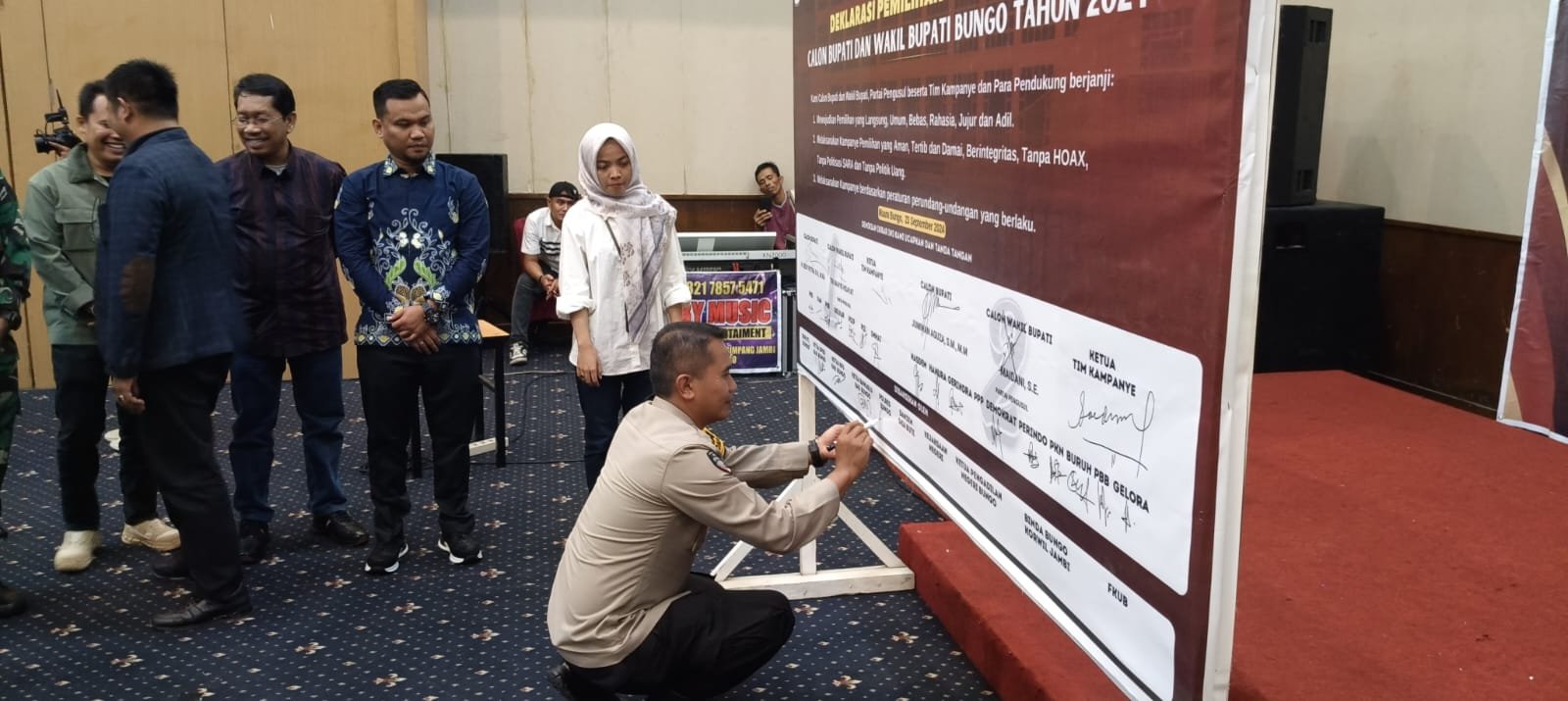 SWARAJAMBI, MUARABUNGO –Kabupaten Bungo menjadi saksi pelaksanaan Deklarasi Damai Peserta Pemilu Tahun 2024, pada Hari Senin (23/9/24)