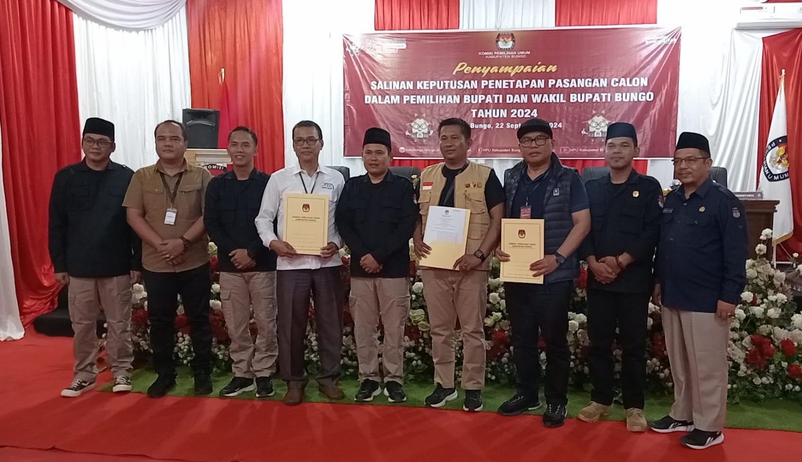 Penyampaian salinan keputusan penetapan pasangan calon dalam pemilihan Bupati dan Wakil Bupati Bungo tahun 2024 ini disampaikan langsung oleh ketua KPU Bungo Armidis, di aula kantor KPU Kabupaten Bungo pada minggu (22/9/2024)