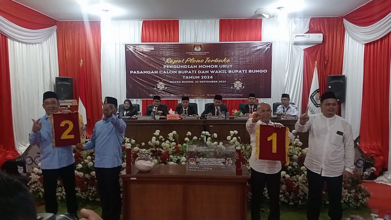 Hal itu berdasarkan hasil pengundian nomor urut calon bupati-calon wakil bupati (cabup-cawabup) Bungo yang digelar di aula kantor KPU Kabupaten Bungo, Senin 23 September 2024.