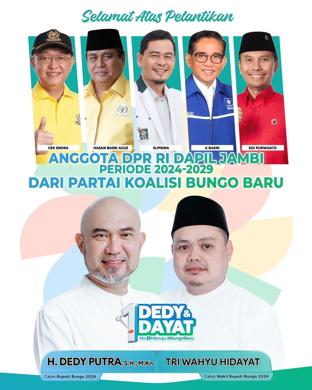Calon Bupati Bungo nomor urut 1, H Dedy Putra menyampaikan ucapan selamat kepada anggota DPR RI Dapil Jambi yang hari ini di ambil sumpah sebagai anggota DPR RI Periode 2024-2029.