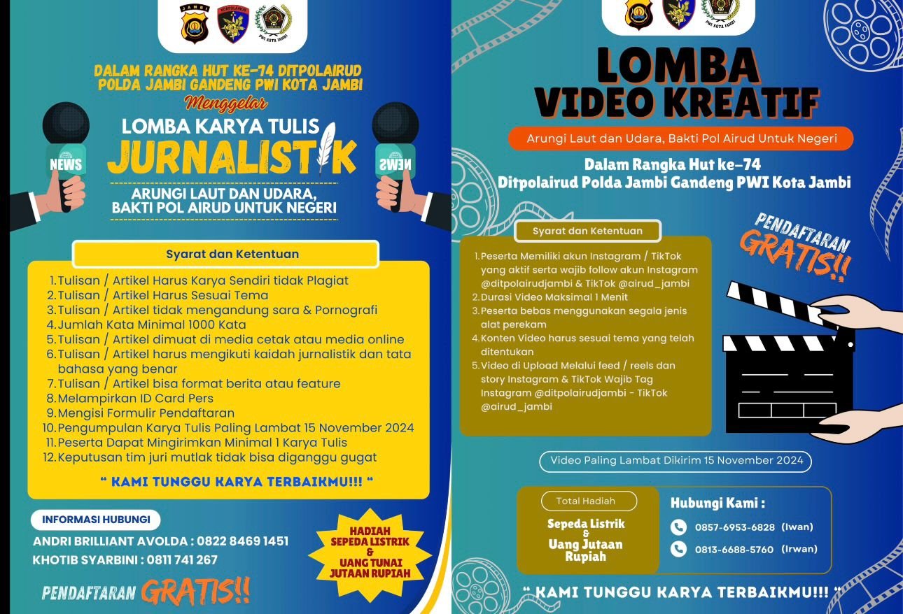 SWARAJAMBI, JAMBI – Dalam rangka menyambut Hari Ulang Tahun ke 74 yang jatuh pada tanggal 01 Desember 2024, Direktorat Kepolisian dan Udara akan melaksanakan lomba karya tulis Jurnalistik bagi wartawan serta video Kreatif untuk masyarakat dengan hadiah utama satu unit Sepeda listrik dan uang jutaan rupiah.