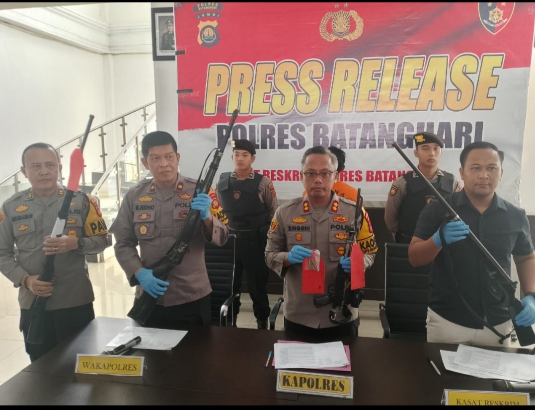 Masing-masing barang bukti senpi rakitan itu dipegang Kapolres Singgih Hermawan, Waka Polres Kompol M Ridho, Kasat Reskrim AKP Husni Abda, dan seorang perwira Polres Batanghari.