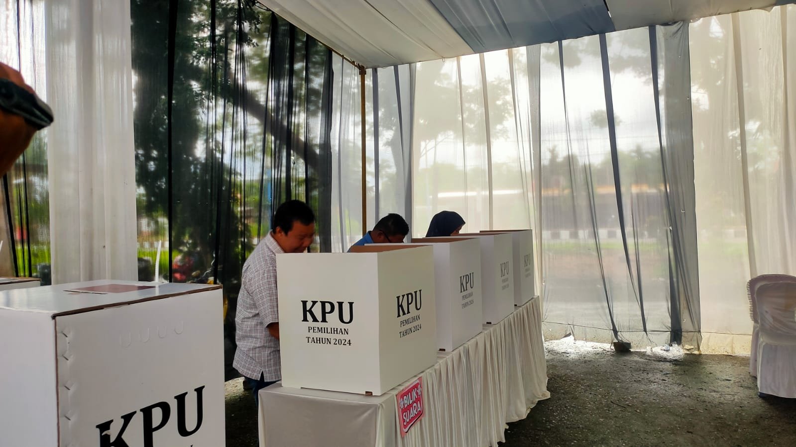 Tiba sekitar pukul 09.00 WIB, Romi datang ke TPS bersama istri dan anak-anaknya. Tiba di TPS Romi tampak ikut antrean bersama warga lainnya untuk melakukan pendaftaran.