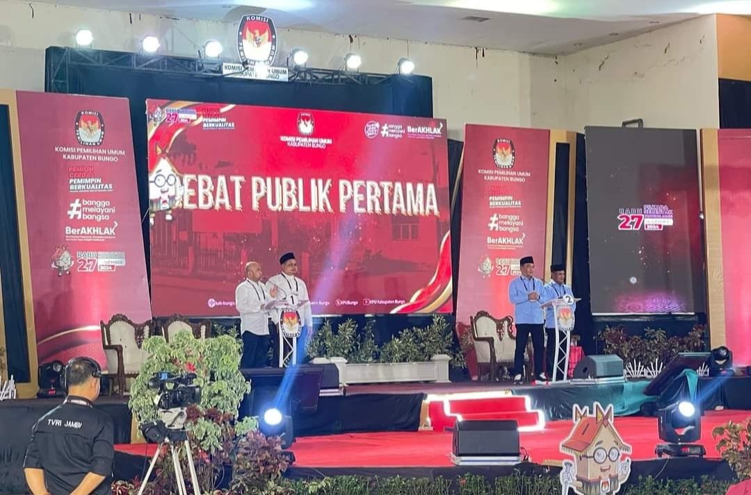 SWARAJAMBI, MUARABUNGO – Komisi Pemilihan Umum Kabupaten Bungo (KPU) menggelar debat perdana Calon Bupati dan Wakil Bupati Bungo. Sabtu 2 Novemver 2024.