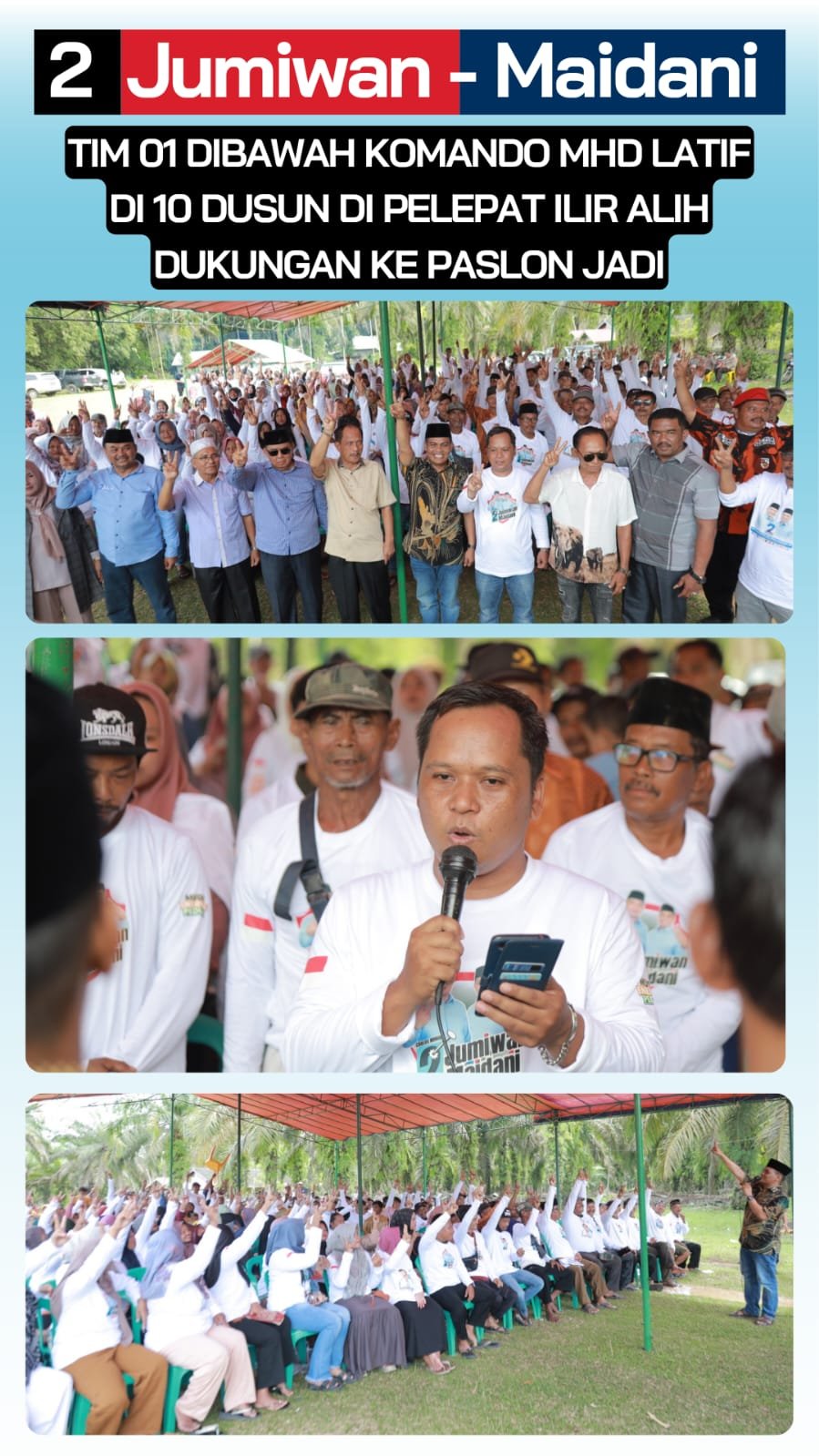 “Kami semua tim 01di bawah koordinasi saya yang ada di Pelepat Ilir dengan sadar dan tanpa intimidasi dari pihak manapun, menyatakan sikap mendukung dan siap memenangkan Paslon nomor urut 2 Jumiwan – Maidani.,” tegas M. Latif disambut tepuk tangan oleh ratusan tim yang pindah ke Paslon 02 JADI.