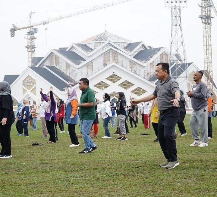 Gubernur Jambi, Al Haris melaksanakan senam sehat bersama ASN hingga Dharmawanita diEx Arena MTQ H Abdurrahman Sayoeti.