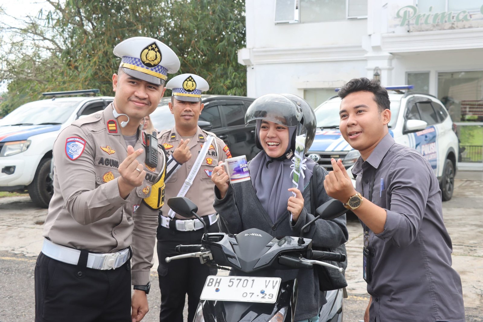 Kasat Lantas Polres Batanghari Iptu Agung Prasetyo Soegiono memberikan sovenir kepada pengendara yang tertib lalu lintas.
