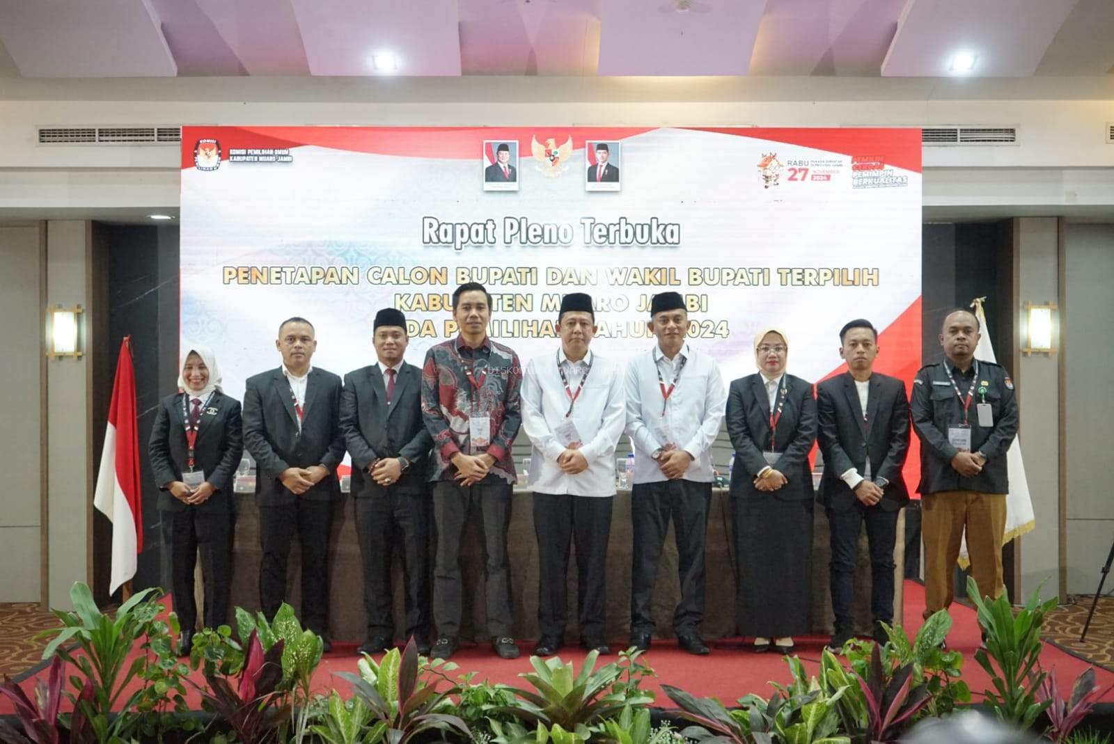 “Menetapkan pasangan calon nomor urut 4, Bambang Bayu Suseno – Junaidi H. Mahir dengan perolehan suara 73.367 atau 31.76 persen sebagai Bupati dan wakil bupati terpilih Kabupaten Muaro Jambi periode 2025-2030 dalam pemilihan kepala daerah 2024,” kata Al Muttaqin.