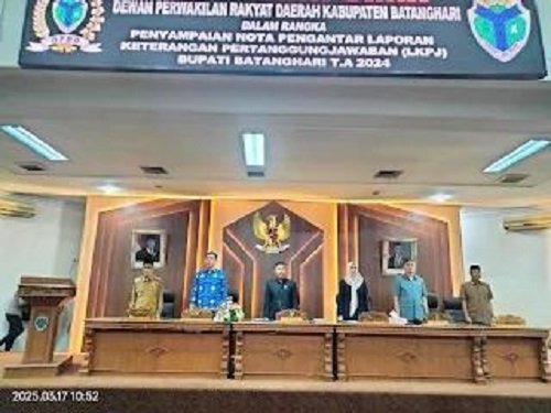 SWARAJAMBI.NET, BATANGHARI – Dewan Perwakilan Rakyat Daerah (DPRD) Kabupaten Batanghari menggelar rapat paripurna Penyampaian Nota Pengantar Laporan Keterangan Pertanggungjawaban (LKPJ) Bupati tahun anggaran 2024. Rapat digelar di ruang paripurna gedung DPRD Batanghari, Senin (17/3/2025).