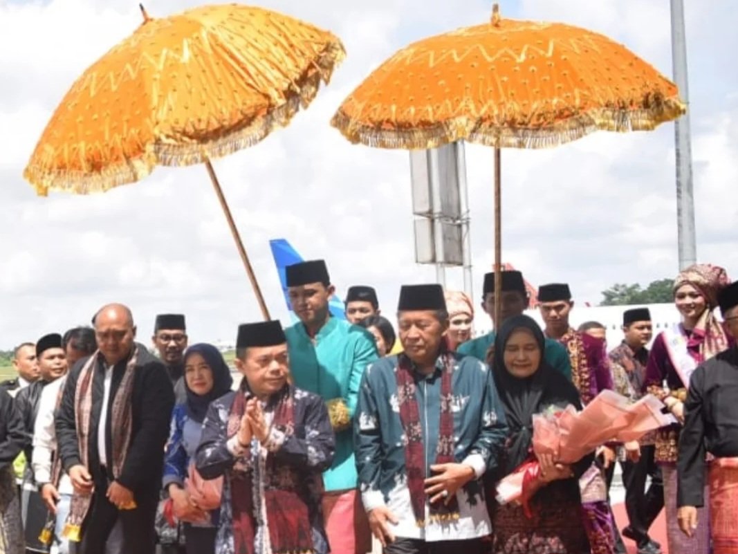 Kedatangan mereka disambut secara meriah di VIP Bandara Sultan Thaha Jambi dengan tarian persembahan. Tampak keduanya kompak mengenakan pakaian batik Jambi berwarna gelap dengan syal khas Batik Jambi yang dikalungkan saat penyambutan.