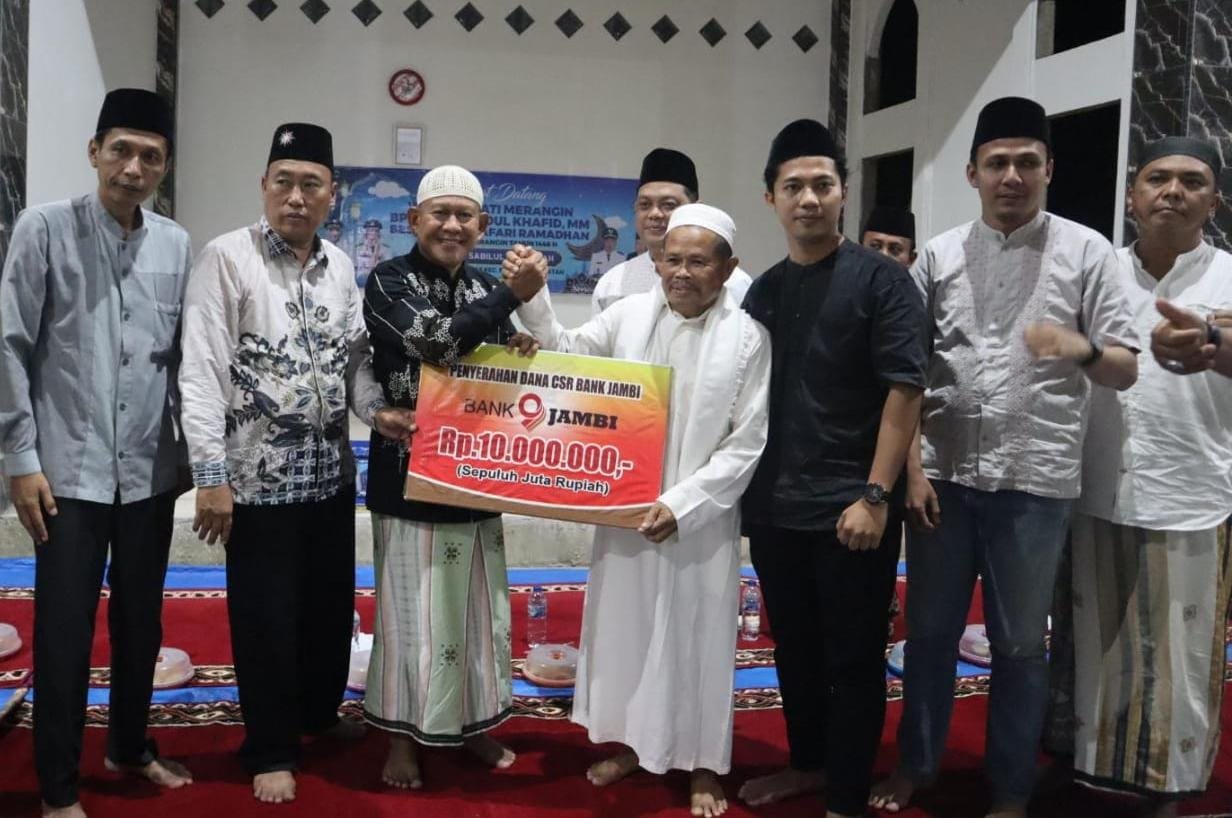 Usai menjalankan Sholat Isya dan Tarawih, wabup menyalurkan dana sebesar Rp 10 juta dari Bank 9 Jambi untuk membantu pembangunan Masjid Sabilul Khasanah, yang memang sedang membutuhkan dana pembangunan.