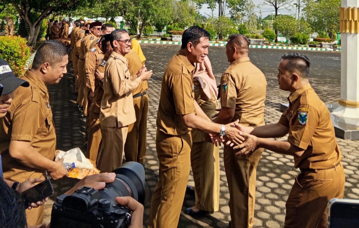 Bupati Fadhil Arief terlihat sangat senang dengan semangat antusias kehadiran para ASN yang mengikuti apel gabungan. Kehadiran para ASN sampai lapangan halaman kantor bupati padat.