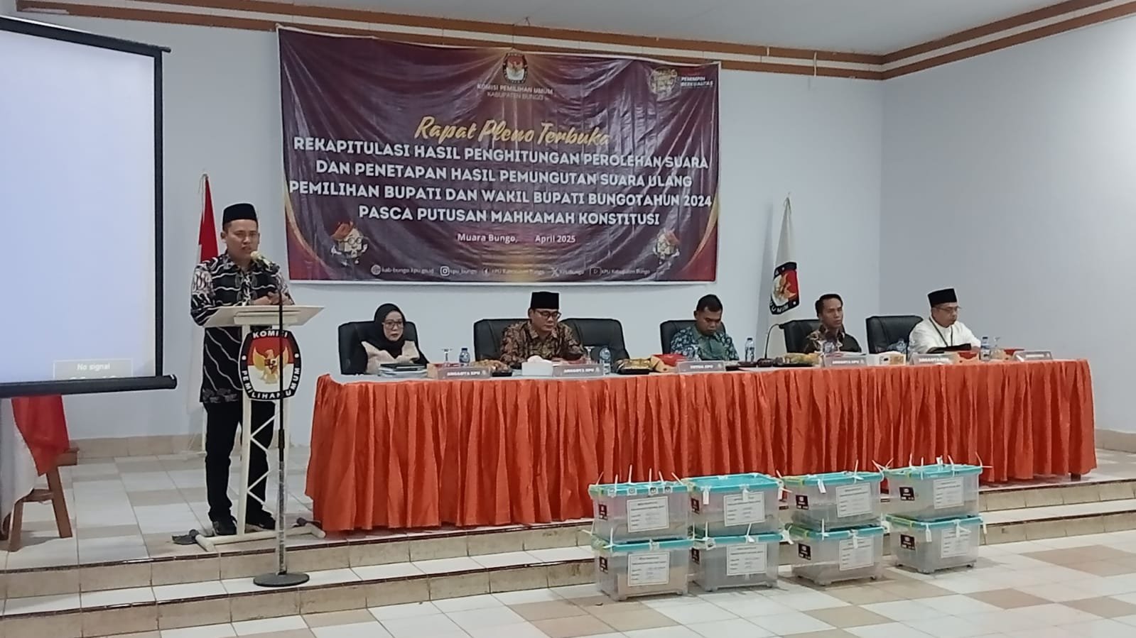 KPU Bungo melaksanakan Rapat Pleno Rekapitulasi Hasil Perhitungan Perolehan Suara dan Penetapan Hasil Pemungutan Suara Ulang Pasca Putusan Mahkamah Konsitusi (MK), Senin (7/4/2025).