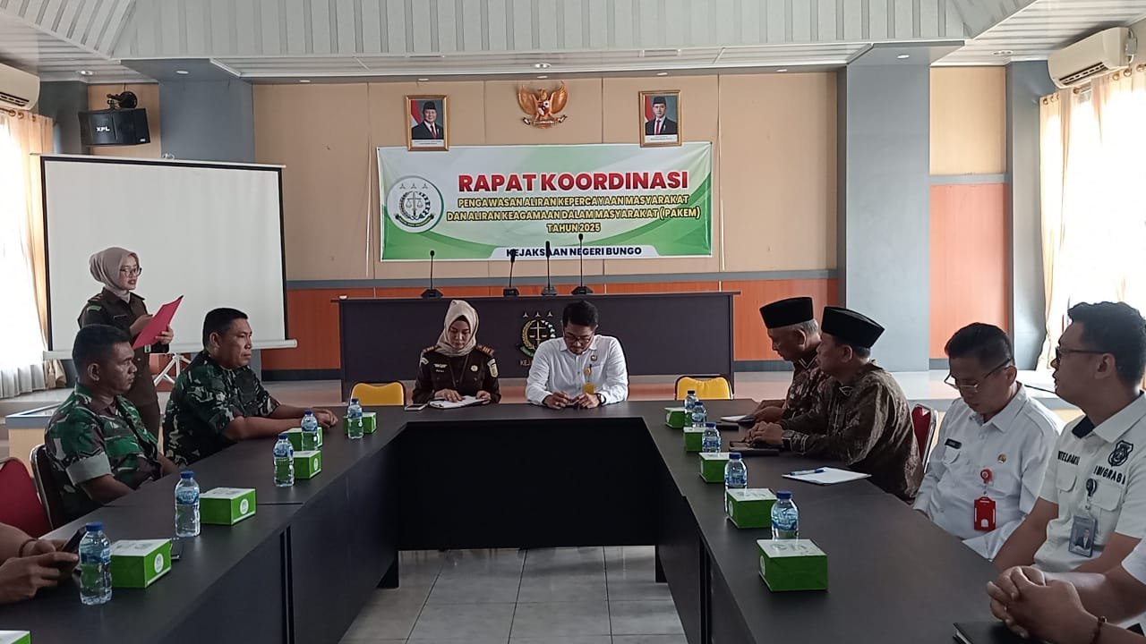 SWARAJAMBI.NET, MUARABUNGO– Kejaksaan Negeri (Kejari) Bungo mengadakan Rapat Koordinasi (Rakor) Tim Pengawasan Aliran Kepercayaan dan Aliran Keagamaan dalam Masyarakat (Pakem) tahun 2025. Kegiatan ini bertujuan untuk memperkuat sinergi antarinstansi dalam mengantisipasi dan mengawasi potensi munculnya aliran kepercayaan dan keagamaan yang menyimpang di wilayah Kabupaten Bungo, Rabu (28/5/2025).