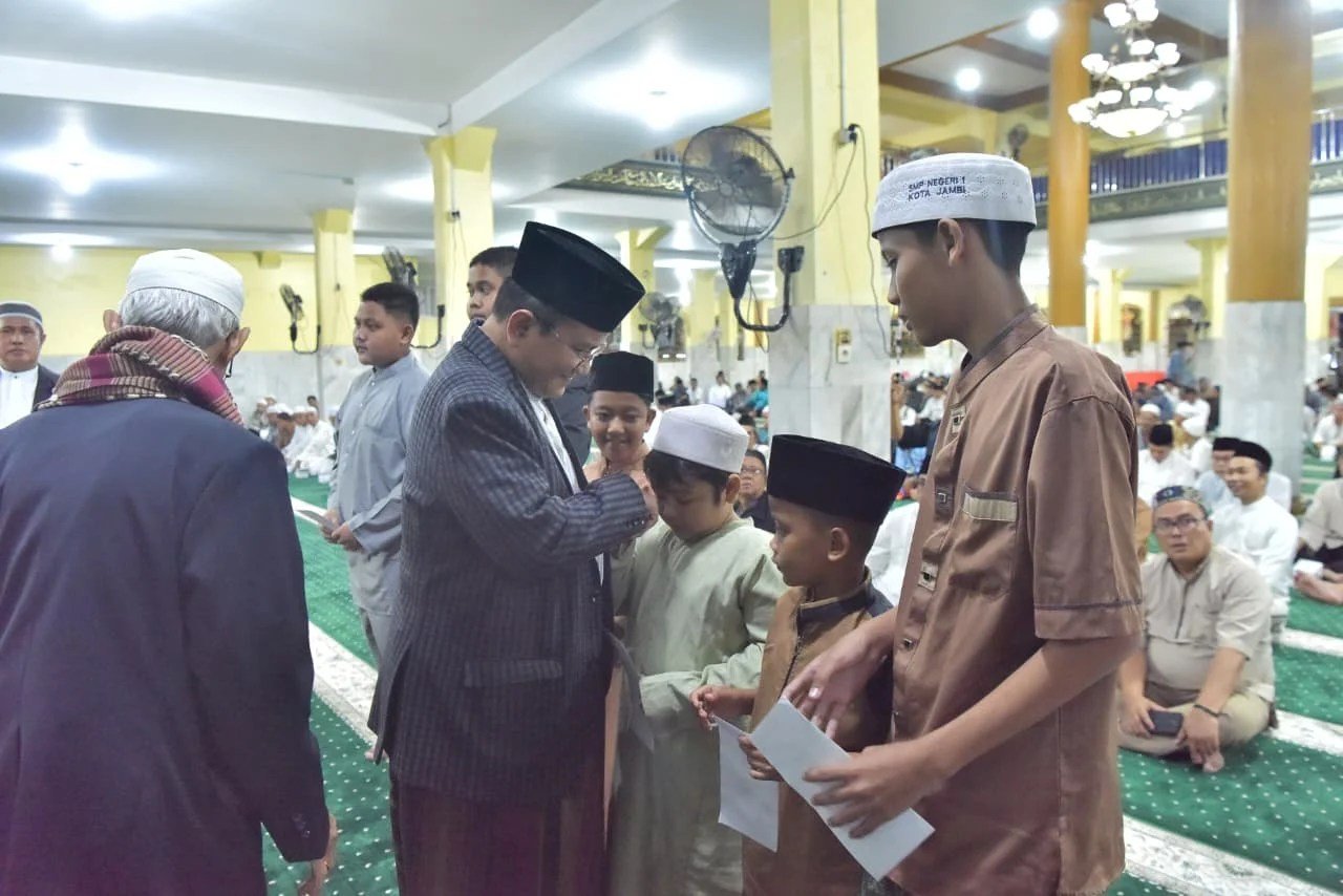 Pemkot Jambi secara simbolis memberikan santunan kepada anak-anak yatim di sekitar Masjid Magatsari, yang diserahkan langsung oleh Wali Kota Maulana.
