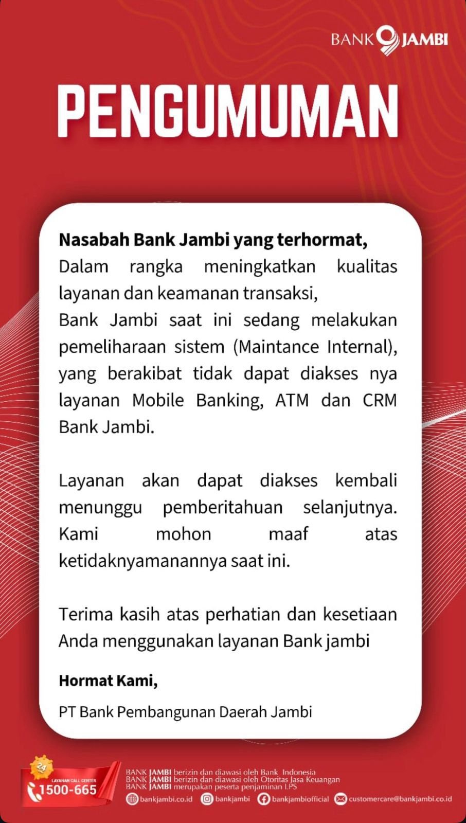 Dalam pengumuman resminya, manajemen menyampaikan bahwa proses maintenance berdampak pada sementara tidak dapat diaksesnya sejumlah layanan, termasuk Mobile Banking, ATM, dan CRM.