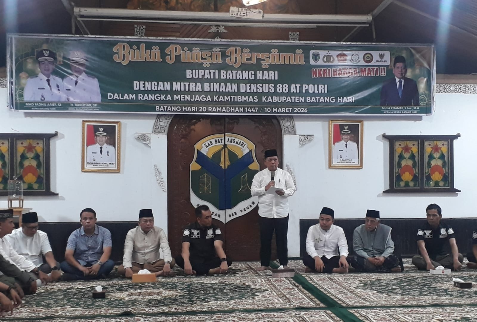 SWARAJAMBI.NET,BATANGHARI – Pemerintah Kabupaten Batang Hari menggelar buka puasa bersama dengan mitra binaan Densus 88 AT Polri. Kegiatan ini berlangsung di serambi Rumah Dinas Bupati Batang Hari, Selasa (10/3/2026).