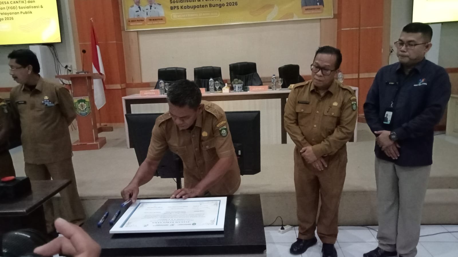 Kegiatan ini ditutup dengan penandatanganan komitmen bersama antarinstansi untuk mendukung implementasi Program Desa Cantik, dilanjutkan dengan Focus Group Discussion (FGD), serta penyerahan plakat simbolis kepada desa-desa terpilih sebagai percontohan di Kabupaten Bungo tahun 2026.